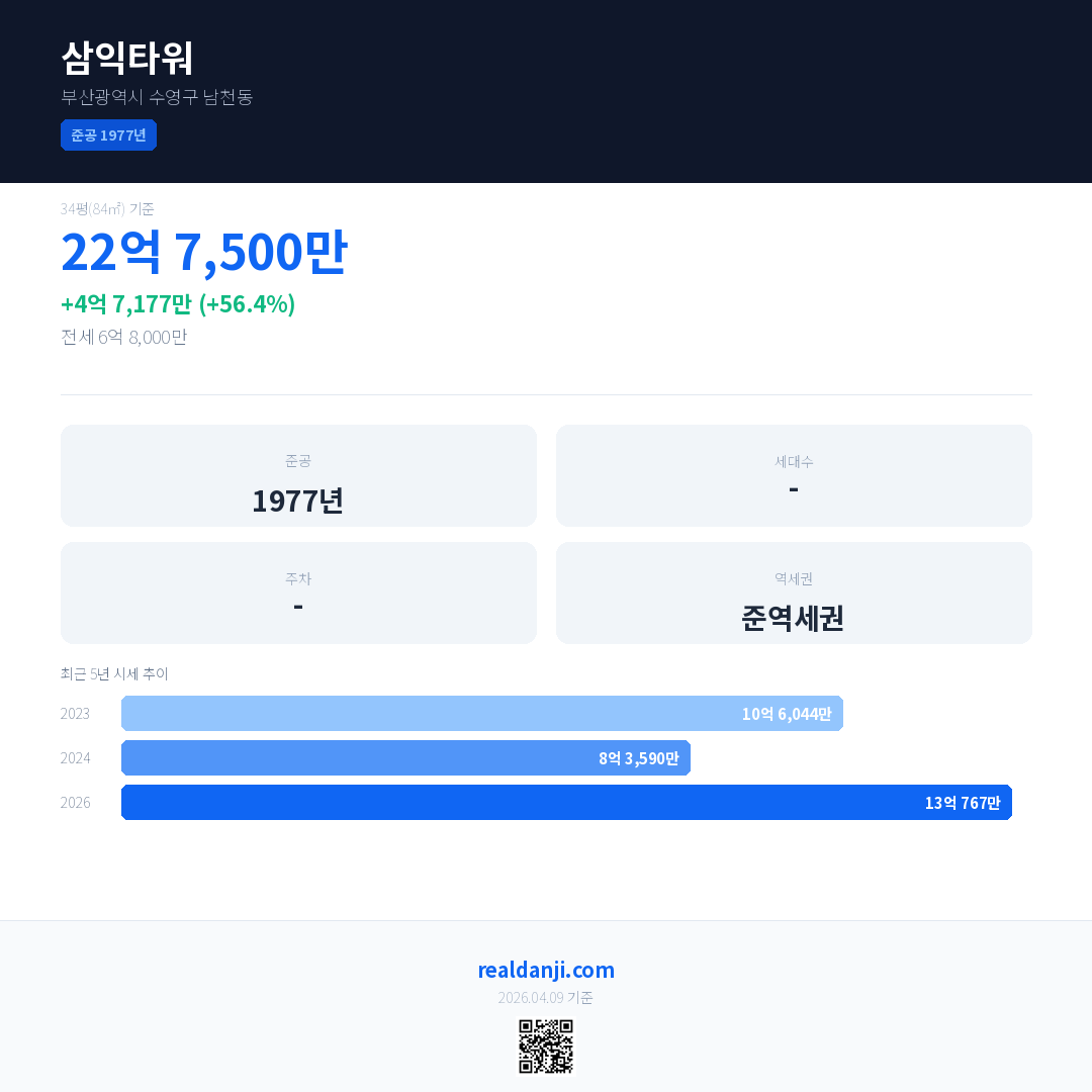 삼익타워 최근 거래가는 22억 7,500만입니다. (2026-04)