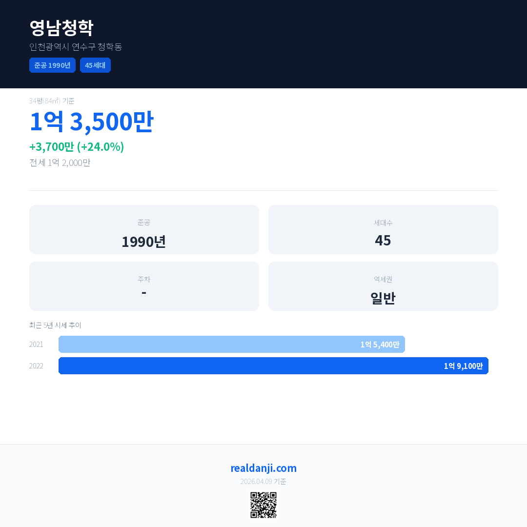 영남청학 국민평형 기준 2022년 평균 거래가는 1억 9,100만으로, 전년 대비 24.0% 상승 했습니다.