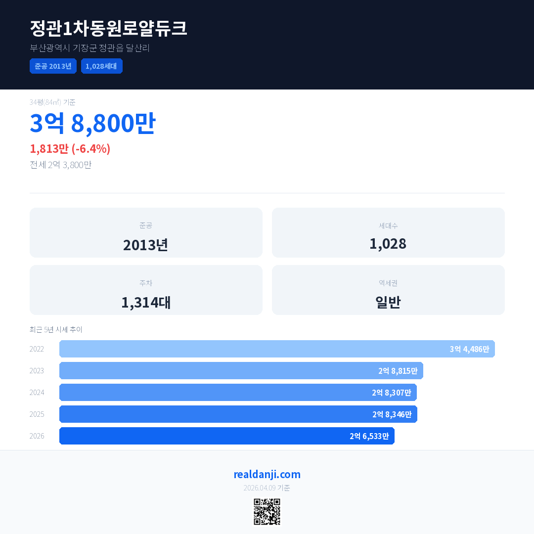 정관1차동원로얄듀크 국민평형 기준 2026년 평균 거래가는 2억 6,533만으로, 전년 대비 6.4% 하락 했습니다.