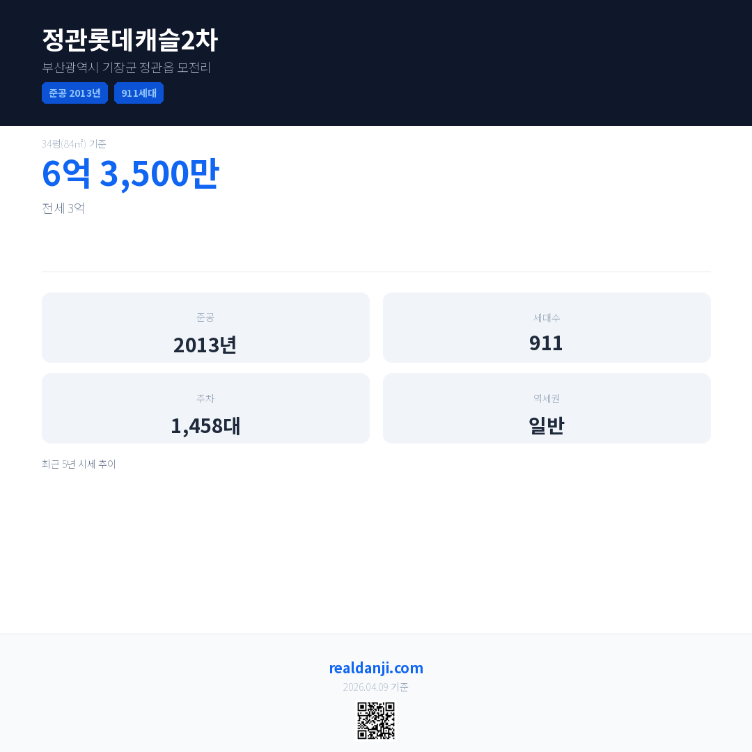 정관롯데캐슬2차은(는) 2013년에 준공되었으며, 현재 13년차입니다. 총 911세대 규모입니다.