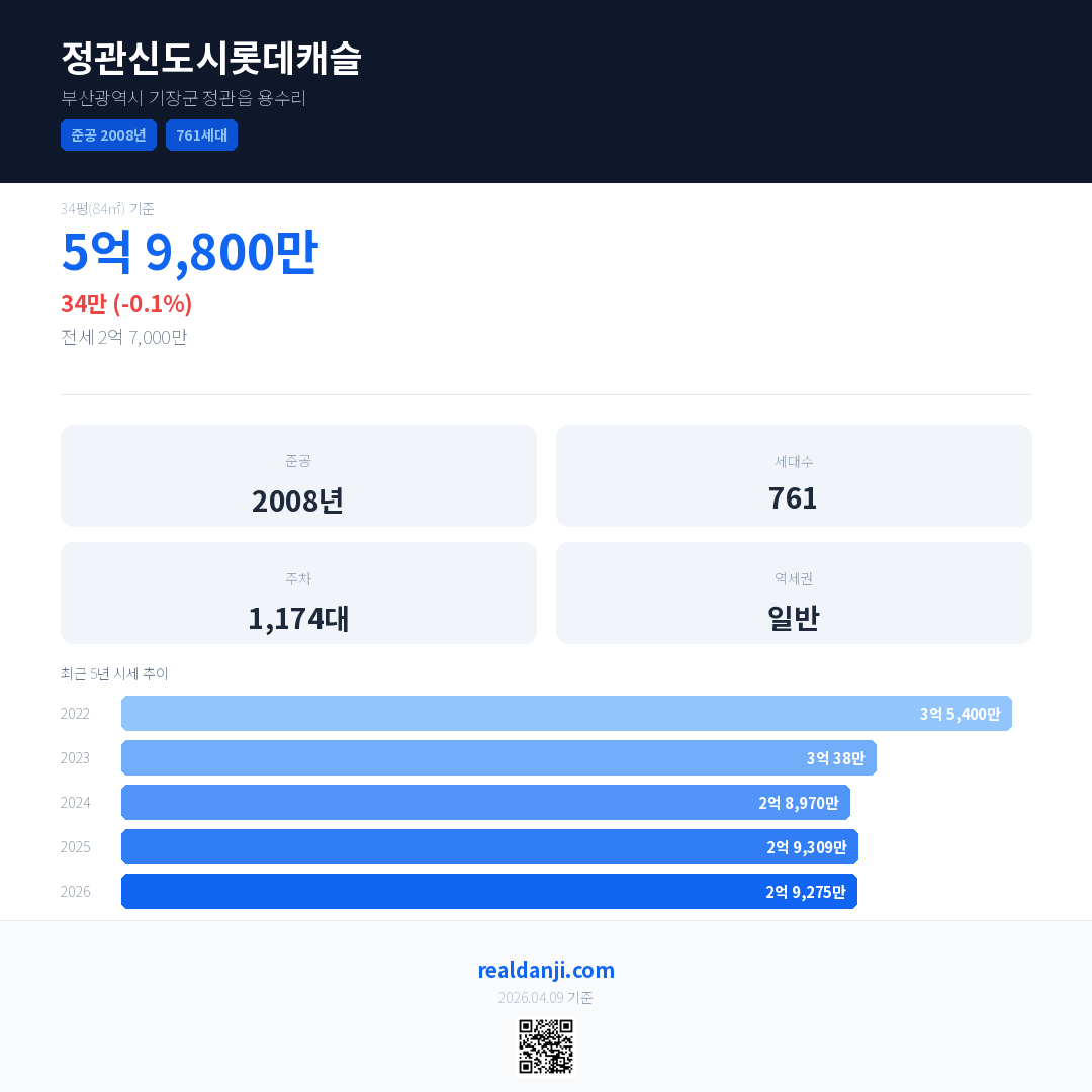 정관신도시롯데캐슬 최근 거래가는 5억 9,800만입니다. (2026-03)