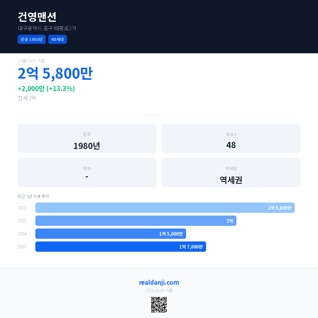 건영맨션 국민평형 기준 2025년 평균 거래가는 1억 7,000만으로, 전년 대비 13.3% 상승 했습니다.