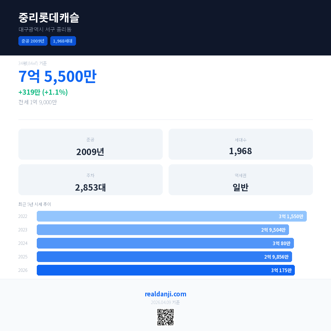 중리롯데캐슬 최근 거래가는 7억 5,500만입니다. (2026-03)