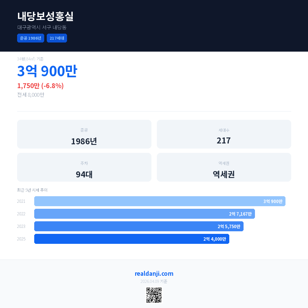 내당보성홍실 국민평형 기준 2025년 평균 거래가는 2억 4,000만으로, 전년 대비 6.8% 하락 했습니다.