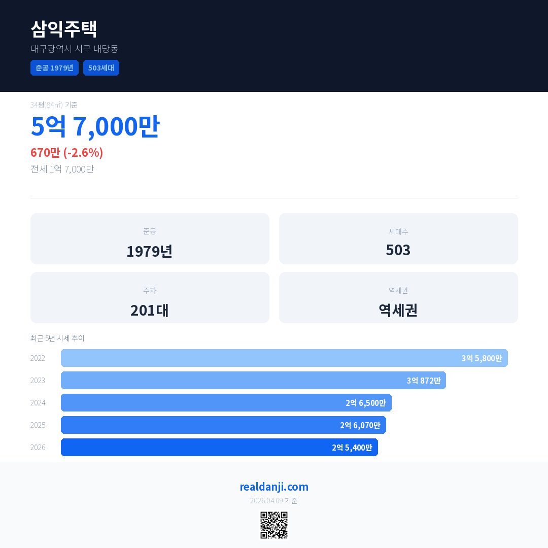 삼익주택 최근 거래가는 5억 7,000만입니다. (2026-02)