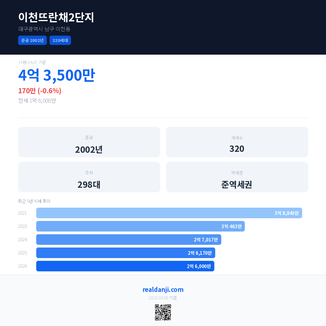 이천뜨란채2단지 최근 거래가는 4억 3,500만입니다. (2026-03)