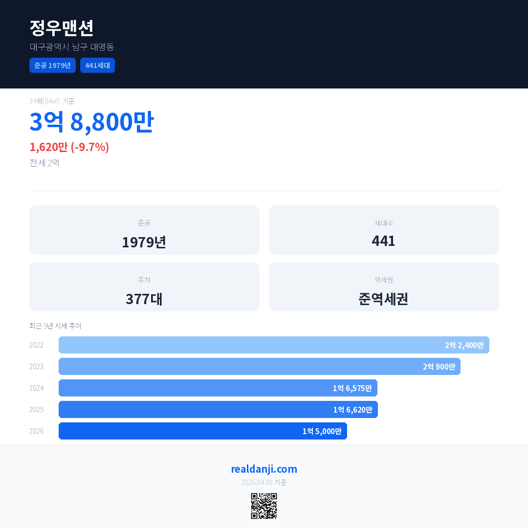 정우맨션 국민평형 기준 2026년 평균 거래가는 1억 5,000만으로, 전년 대비 9.7% 하락 했습니다.