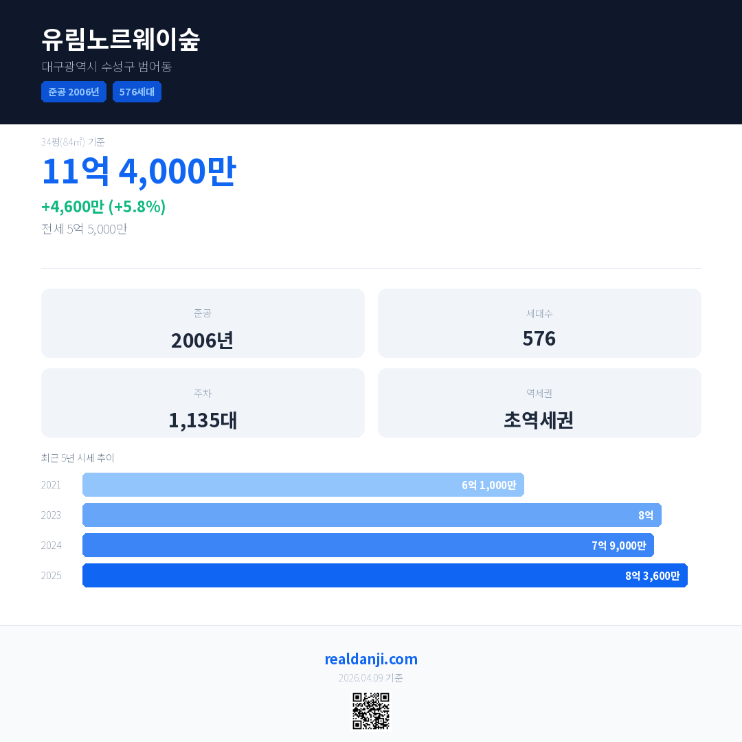 유림노르웨이숲 국민평형 기준 2025년 평균 거래가는 8억 3,600만으로, 전년 대비 5.8% 상승 했습니다.