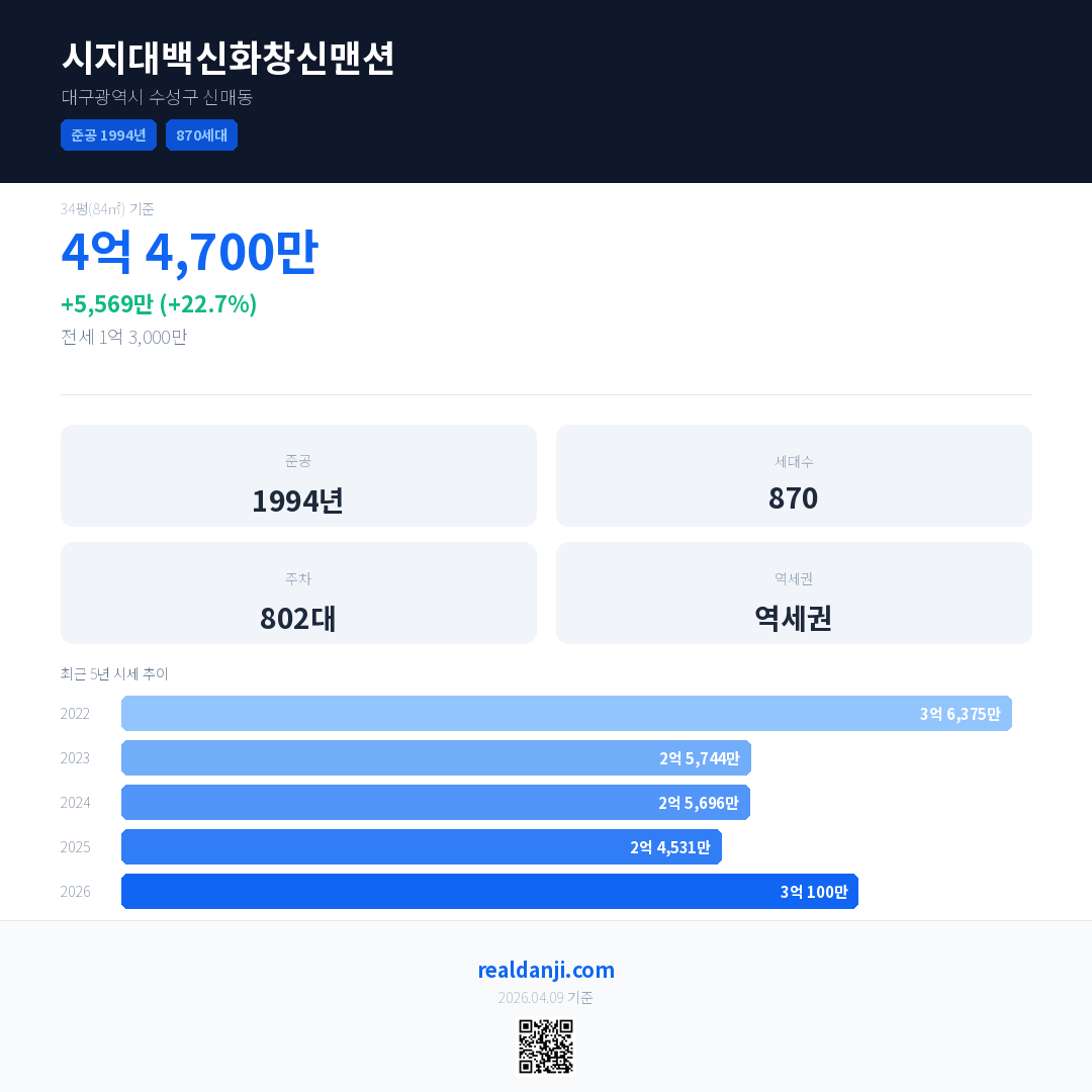 시지대백신화창신맨션 국민평형 기준 2026년 평균 거래가는 3억 100만으로, 전년 대비 22.7% 상승 했습니다.