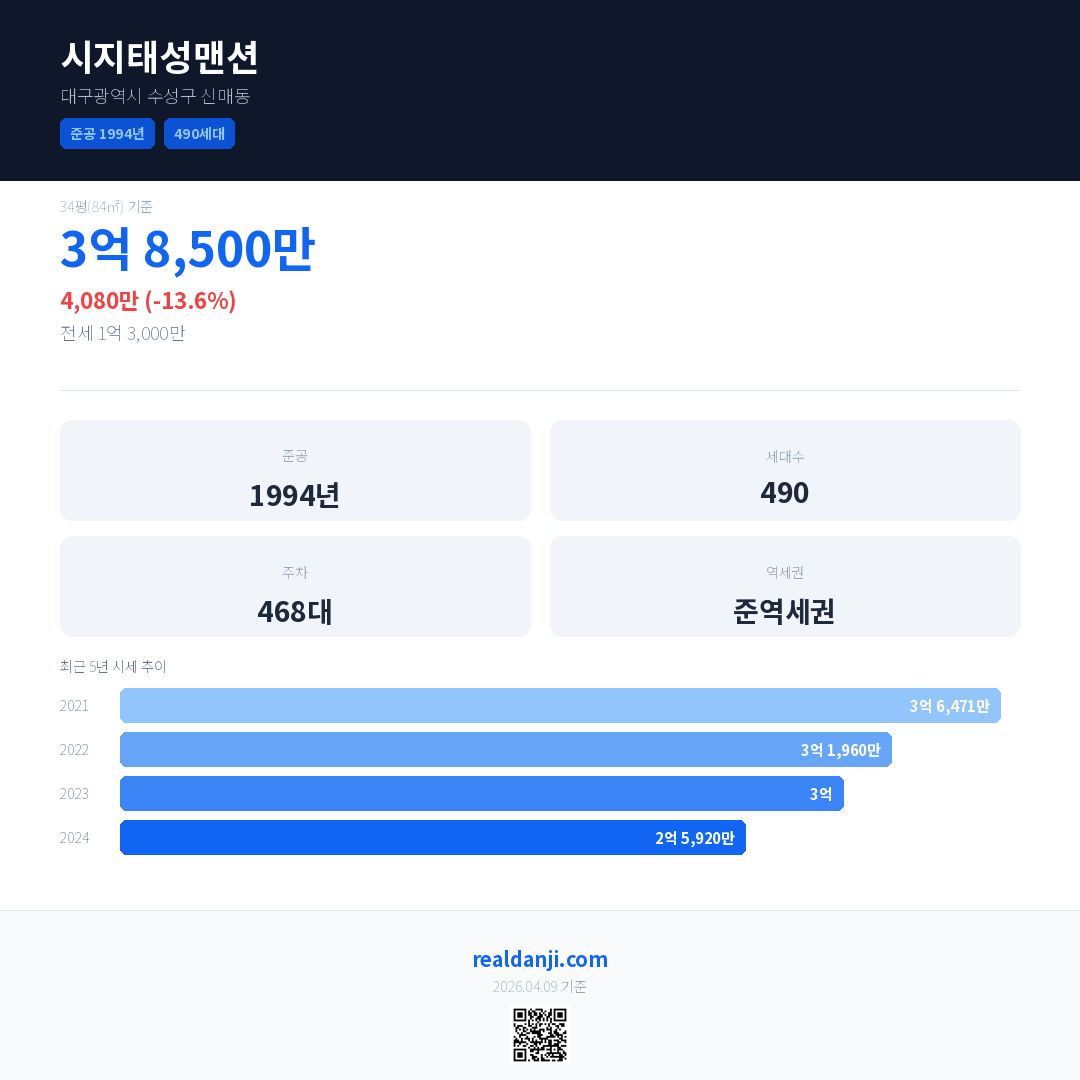 시지태성맨션 국민평형 기준 2024년 평균 거래가는 2억 5,920만으로, 전년 대비 13.6% 하락 했습니다.