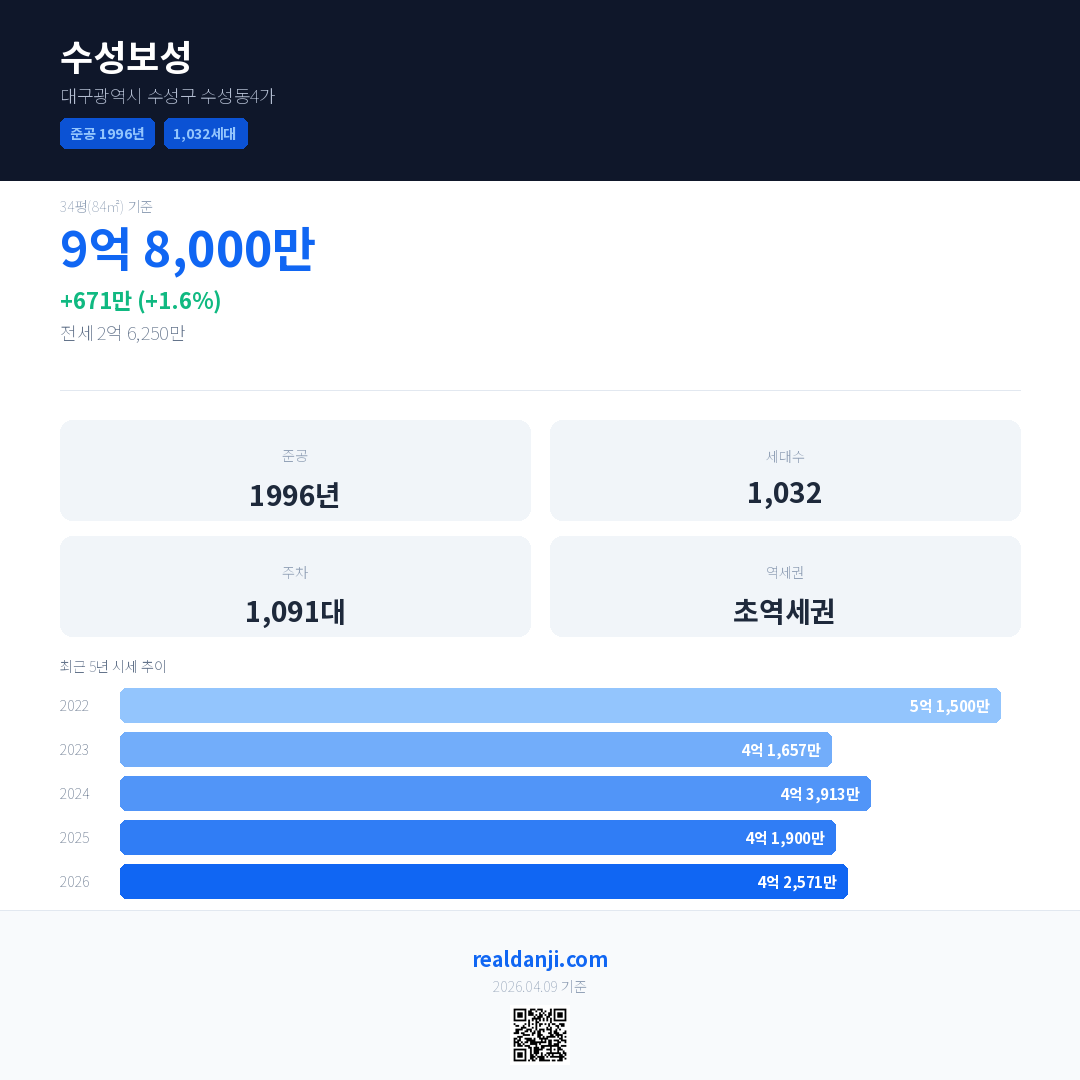 수성보성 국민평형 기준 2026년 평균 거래가는 4억 2,571만으로, 전년 대비 1.6% 상승 했습니다.