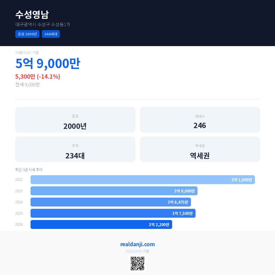 수성영남 국민평형 기준 2026년 평균 거래가는 3억 2,200만으로, 전년 대비 14.1% 하락 했습니다.