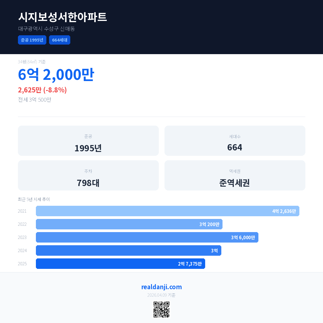시지보성서한아파트 국민평형 기준 2025년 평균 거래가는 2억 7,375만으로, 전년 대비 8.8% 하락 했습니다.