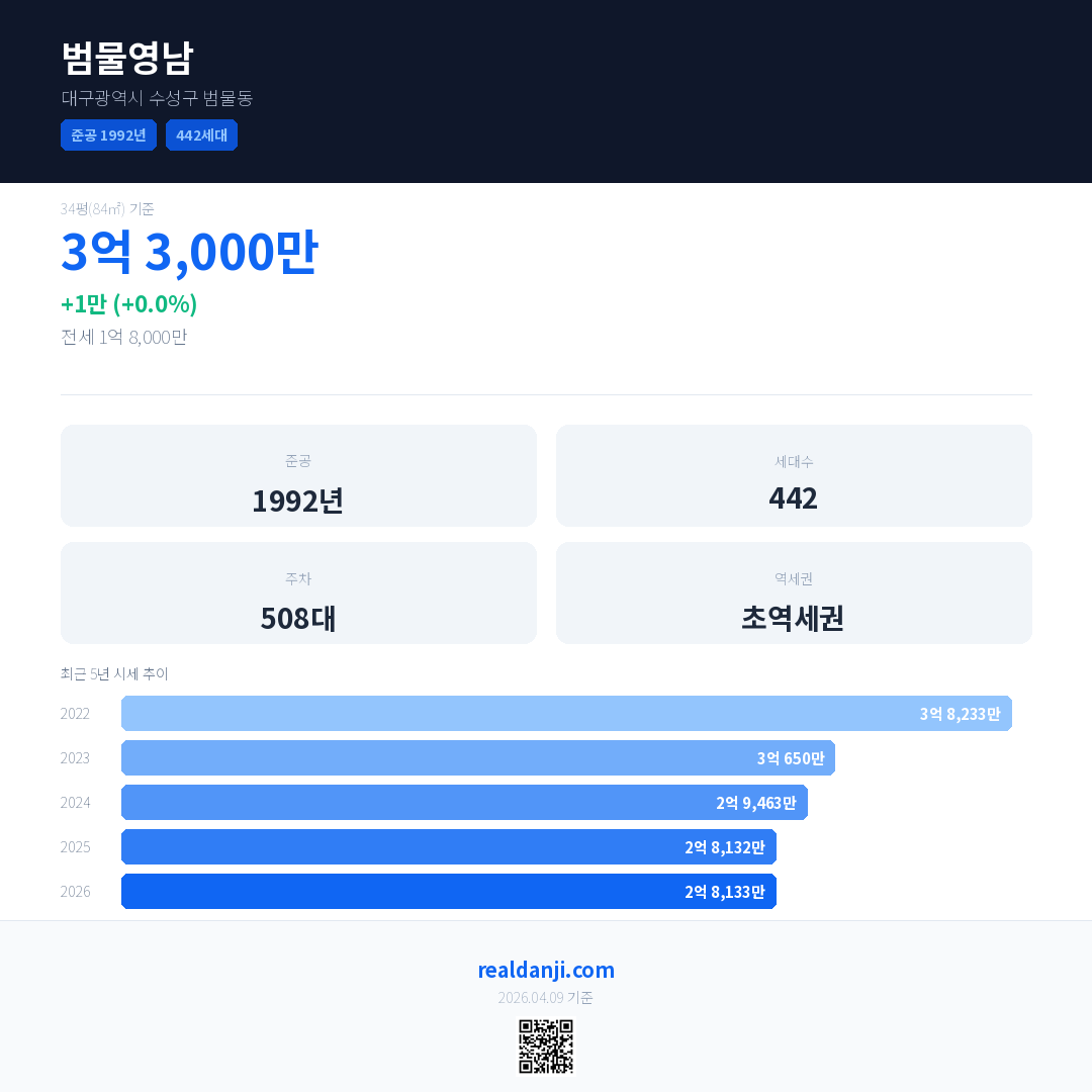 범물영남 국민평형 기준 2026년 평균 거래가는 2억 8,133만으로, 전년 대비 0.0% 하락 했습니다.