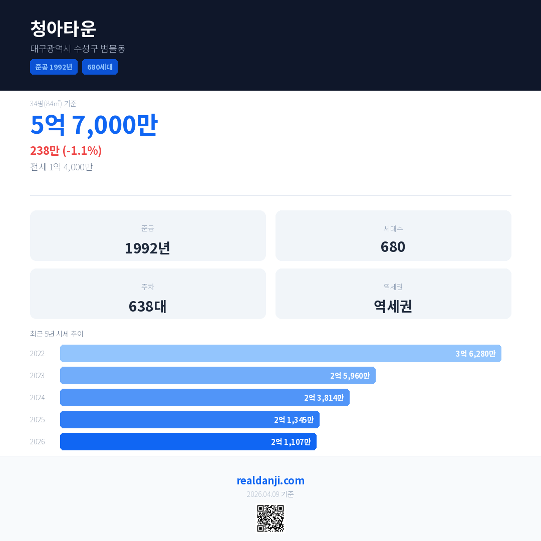 청아타운은(는) 1992년에 준공되었으며, 현재 34년차입니다. 총 680세대 규모입니다.