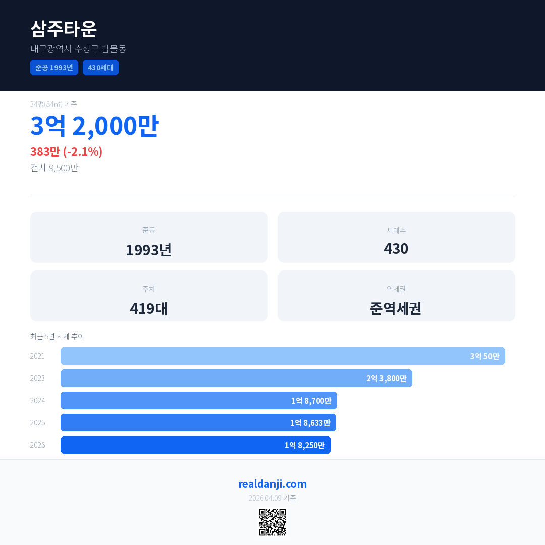 삼주타운은(는) 1993년에 준공되었으며, 현재 33년차입니다. 총 430세대 규모입니다.