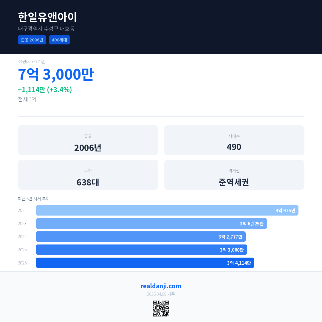 한일유앤아이 국민평형 기준 2026년 평균 거래가는 3억 4,114만으로, 전년 대비 3.4% 상승 했습니다.