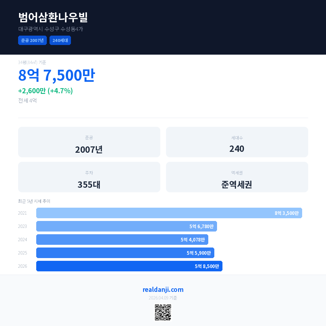 범어삼환나우빌 국민평형 기준 2026년 평균 거래가는 5억 8,500만으로, 전년 대비 4.7% 상승 했습니다.