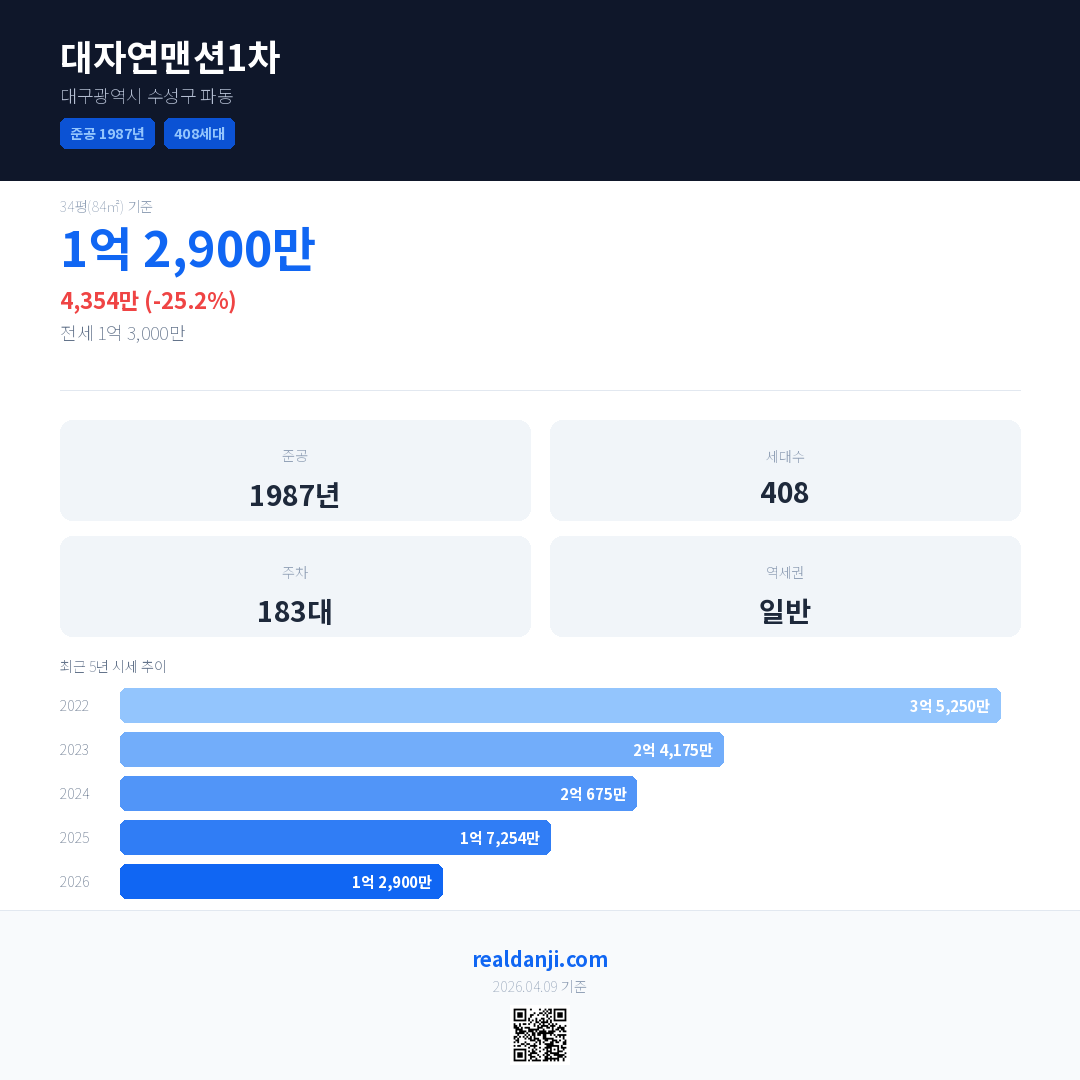 대자연맨션1차 국민평형 기준 2026년 평균 거래가는 1억 2,900만으로, 전년 대비 25.2% 하락 했습니다.