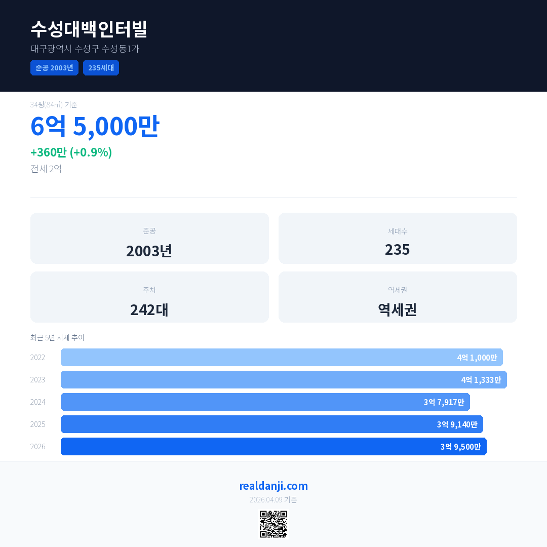 수성대백인터빌 최근 거래가는 6억 5,000만입니다. (2026-03)