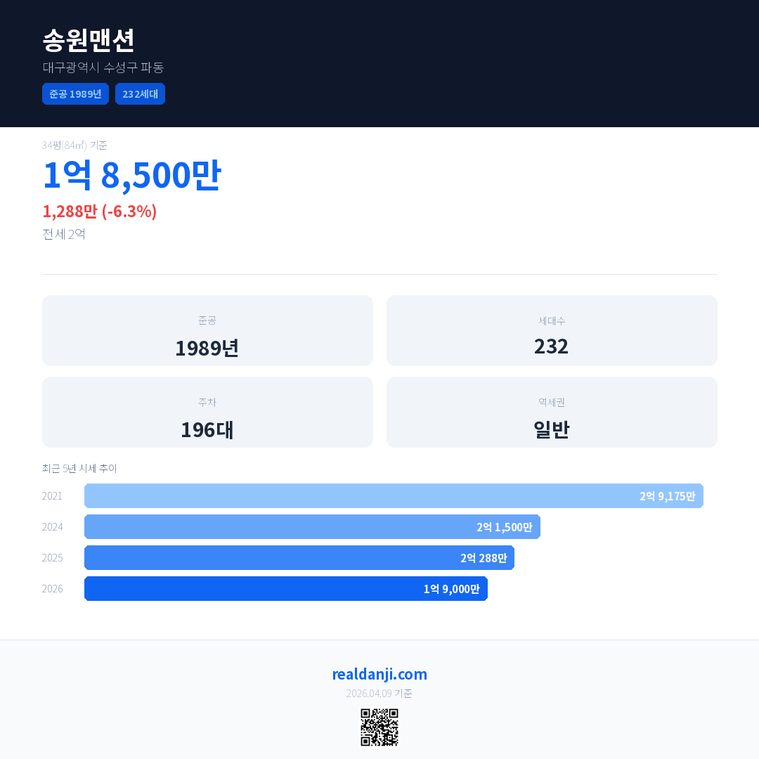 송원맨션 국민평형 기준 2026년 평균 거래가는 1억 9,000만으로, 전년 대비 6.3% 하락 했습니다.