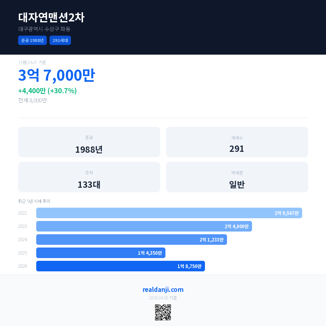 대자연맨션2차 국민평형 기준 2026년 평균 거래가는 1억 8,750만으로, 전년 대비 30.7% 상승 했습니다.