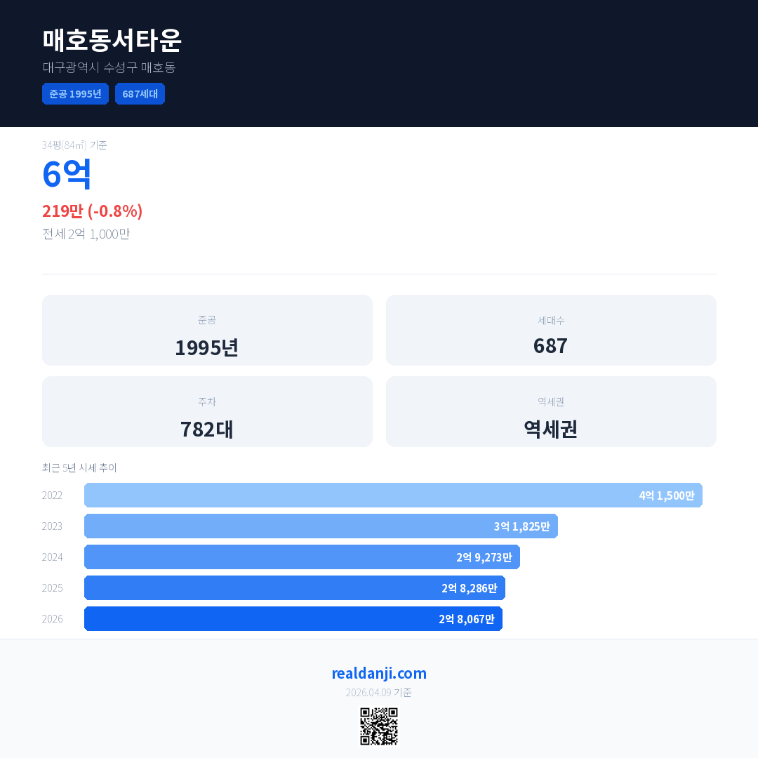 매호동서타운 최근 거래가는 6억입니다. (2026-04)