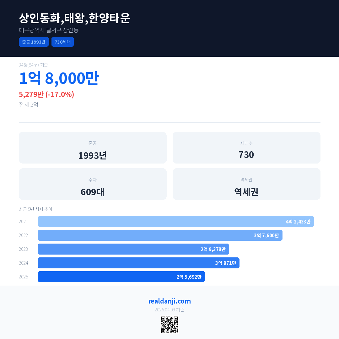 상인동화,태왕,한양타운 국민평형 기준 2025년 평균 거래가는 2억 5,692만으로, 전년 대비 17.0% 하락 했습니다.