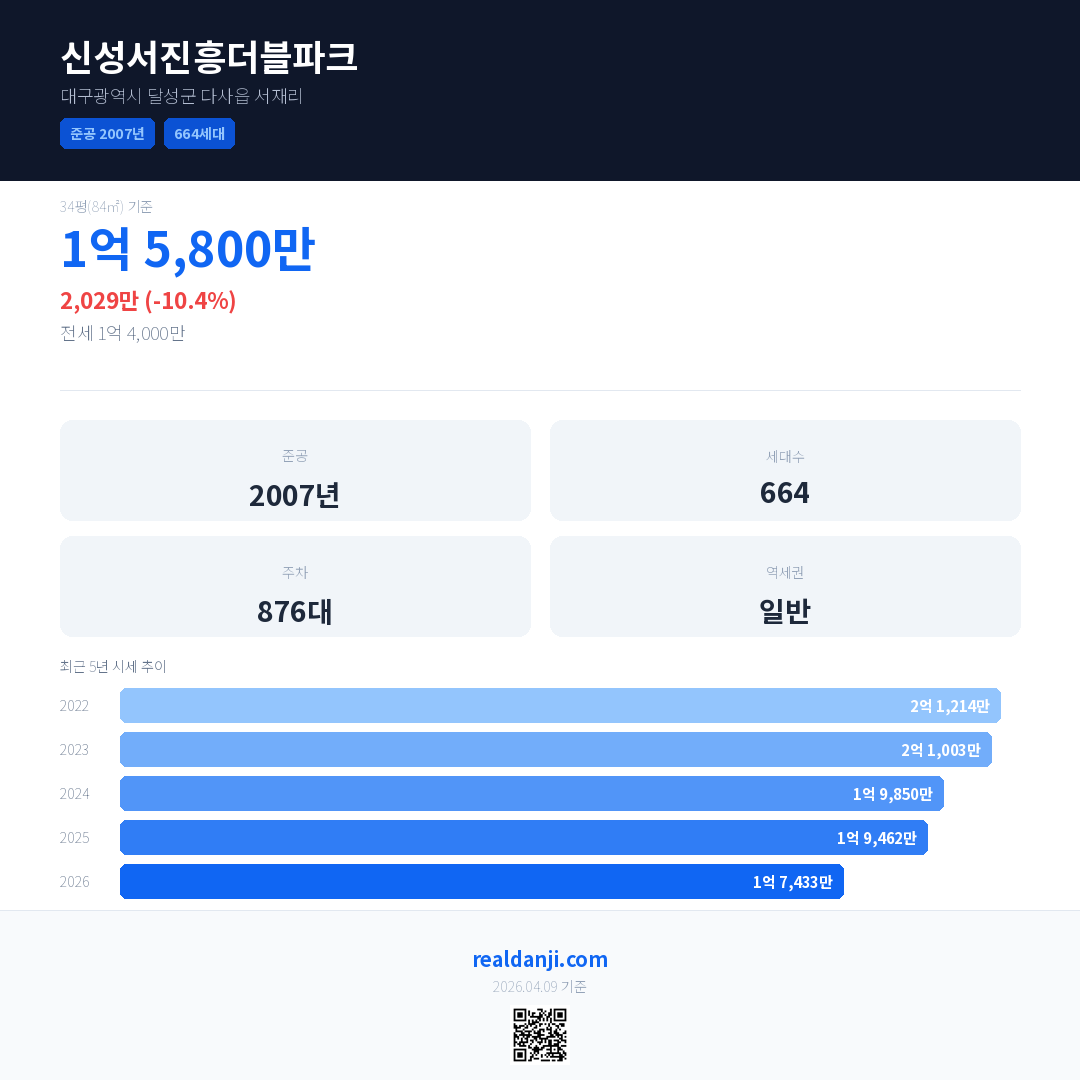 신성서진흥더블파크 국민평형 기준 2026년 평균 거래가는 1억 7,433만으로, 전년 대비 10.4% 하락 했습니다.