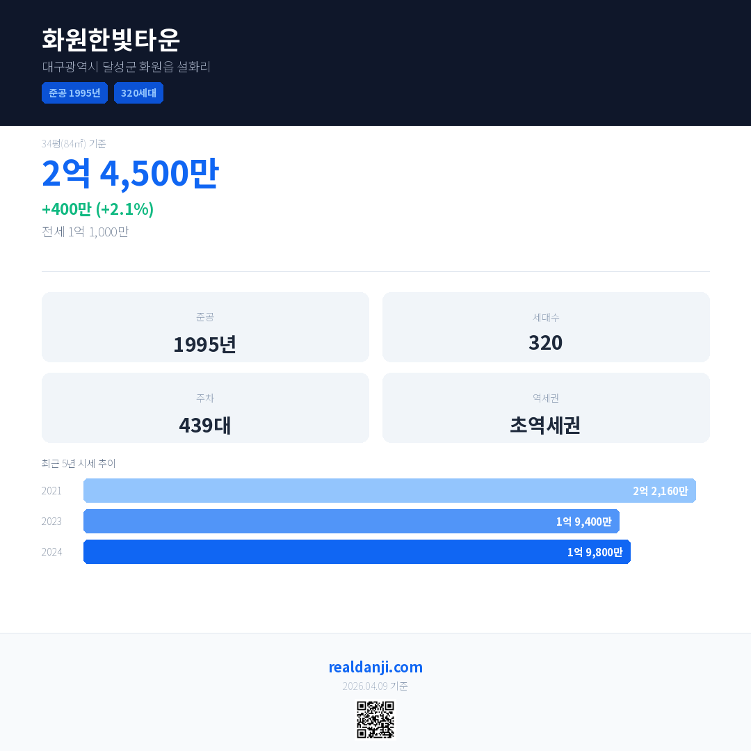 화원한빛타운 국민평형 기준 2024년 평균 거래가는 1억 9,800만으로, 전년 대비 2.1% 상승 했습니다.