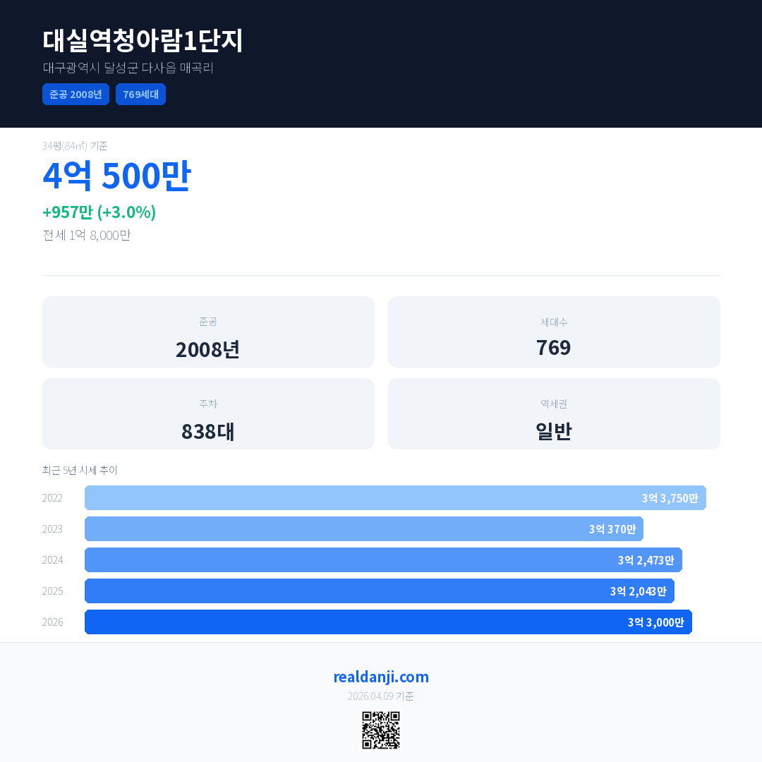 대실역청아람1단지 최근 거래가는 4억 500만입니다. (2026-03)