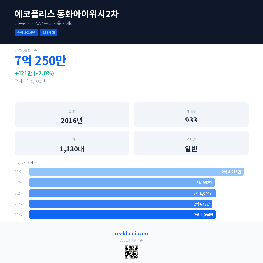 에코폴리스 동화아이위시2차 국민평형 기준 2026년 평균 거래가는 2억 1,094만으로, 전년 대비 2.0% 상승 했습니다.