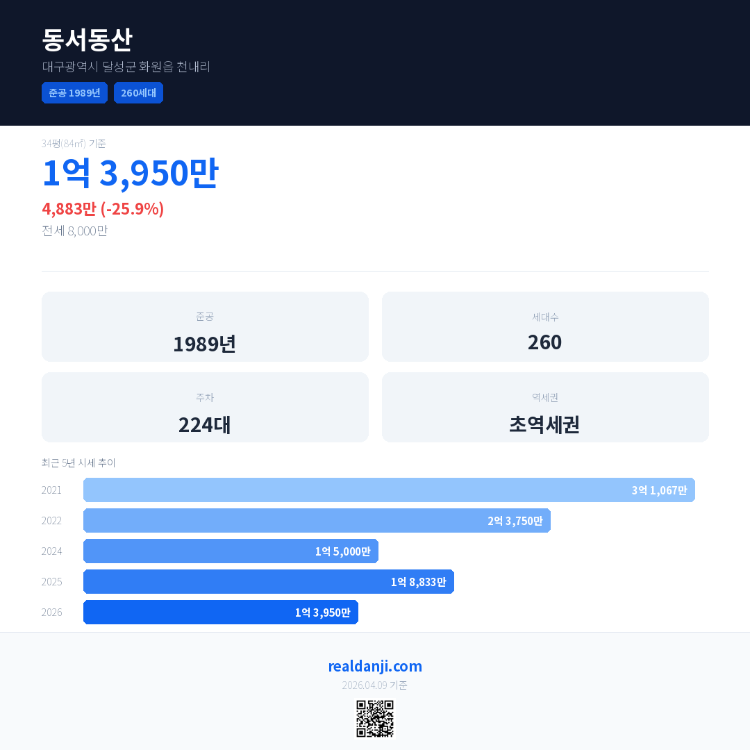 동서동산 국민평형 기준 2026년 평균 거래가는 1억 3,950만으로, 전년 대비 25.9% 하락 했습니다.