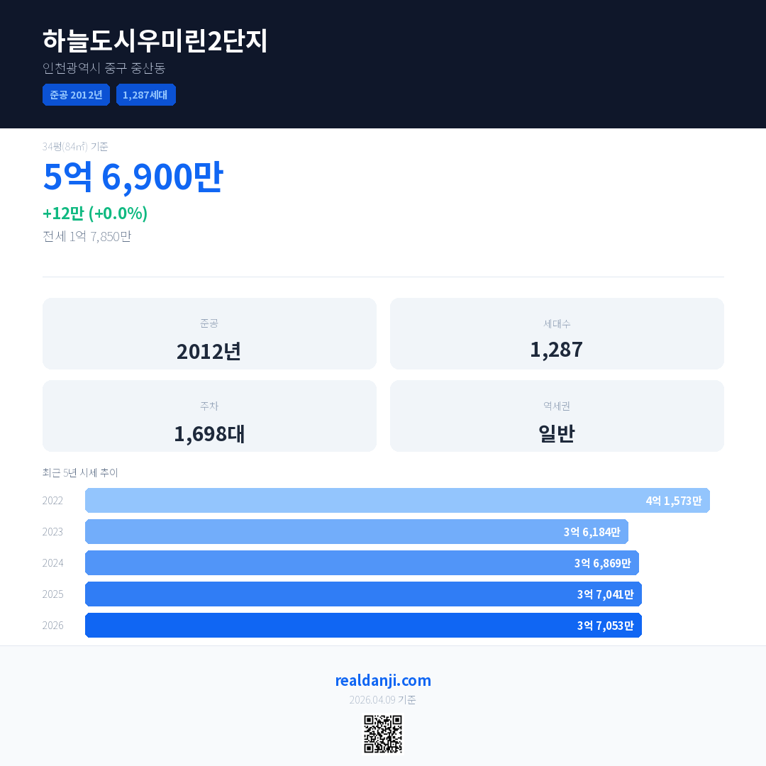 하늘도시우미린2단지 국민평형 기준 2026년 평균 거래가는 3억 7,053만으로, 전년 대비 0.0% 하락 했습니다.
