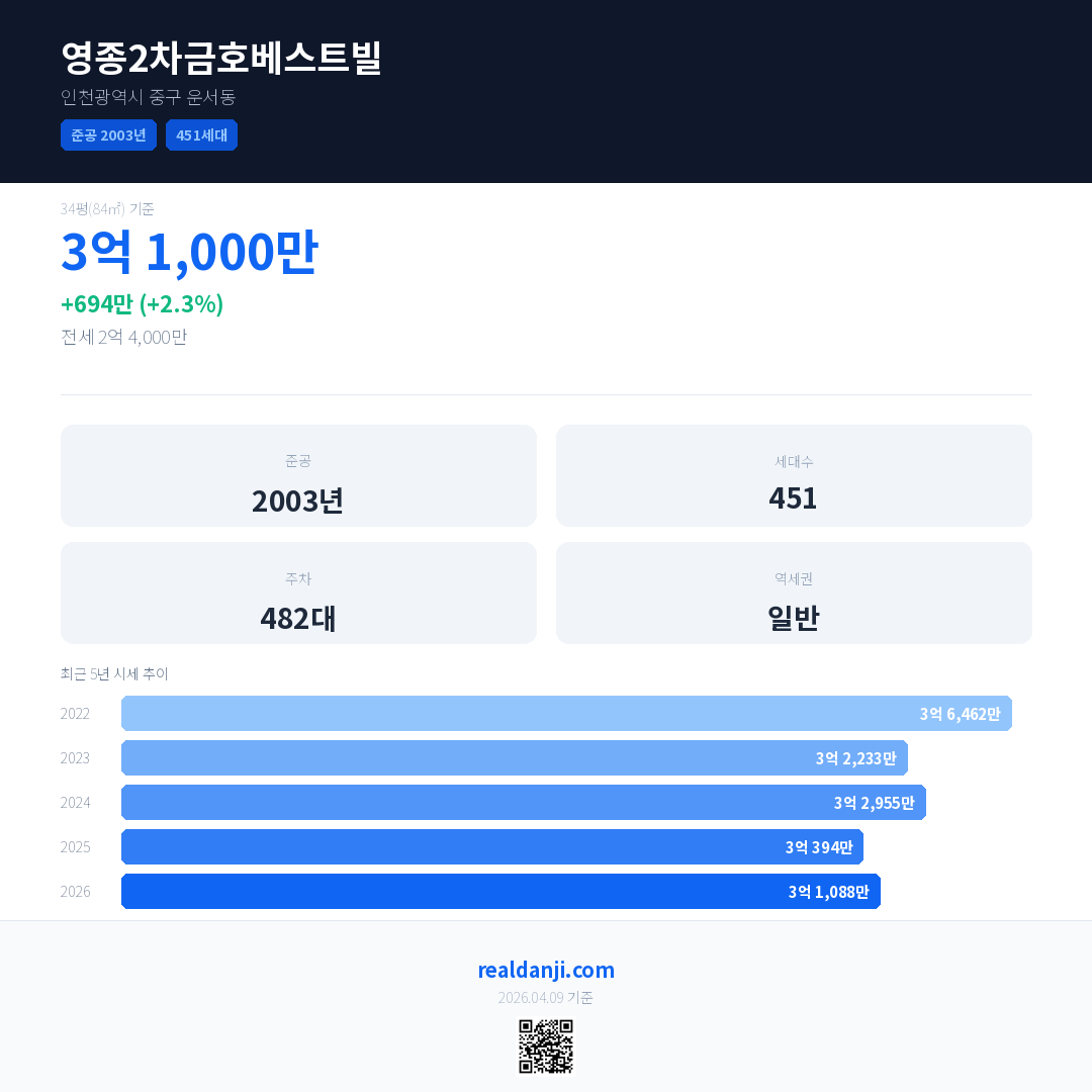 영종2차금호베스트빌 최근 거래가는 4억 9,500만입니다. (2026-04)