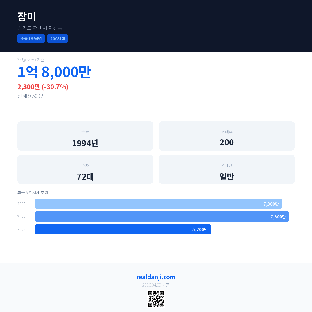장미 국민평형 기준 2024년 평균 거래가는 5,200만으로, 전년 대비 30.7% 하락 했습니다.
