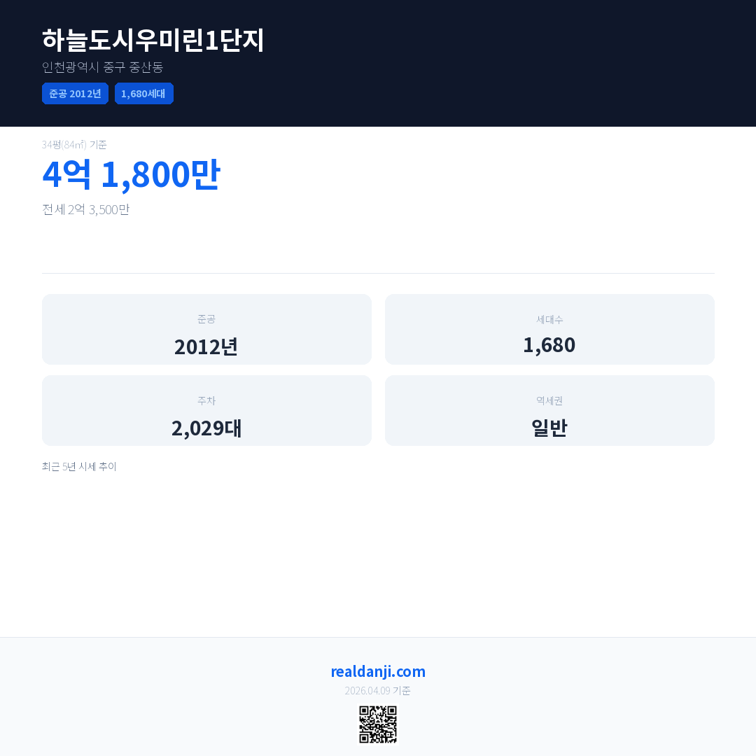 하늘도시우미린1단지 최근 거래가는 4억 1,800만입니다. (2026-04)