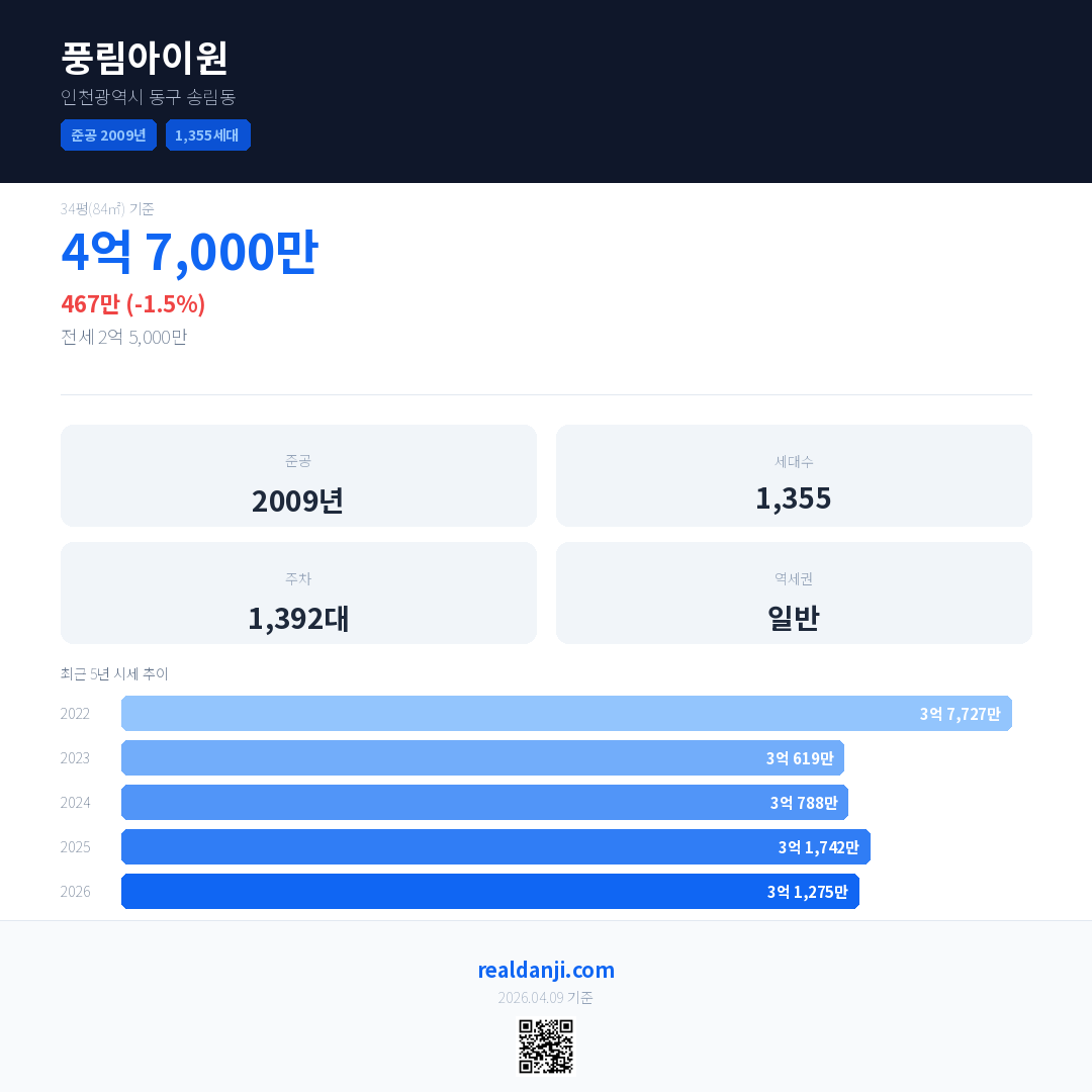 풍림아이원은(는) 2009년에 준공되었으며, 현재 17년차입니다. 총 1,355세대 규모입니다.