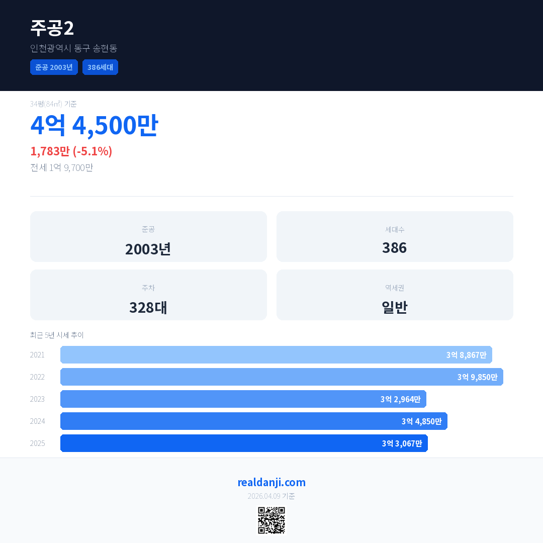 주공2은(는) 2003년에 준공되었으며, 현재 23년차입니다. 총 386세대 규모입니다.