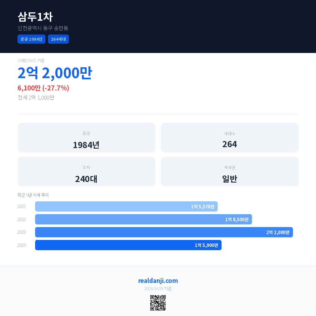 삼두1차 국민평형 기준 2025년 평균 거래가는 1억 5,900만으로, 전년 대비 27.7% 하락 했습니다.