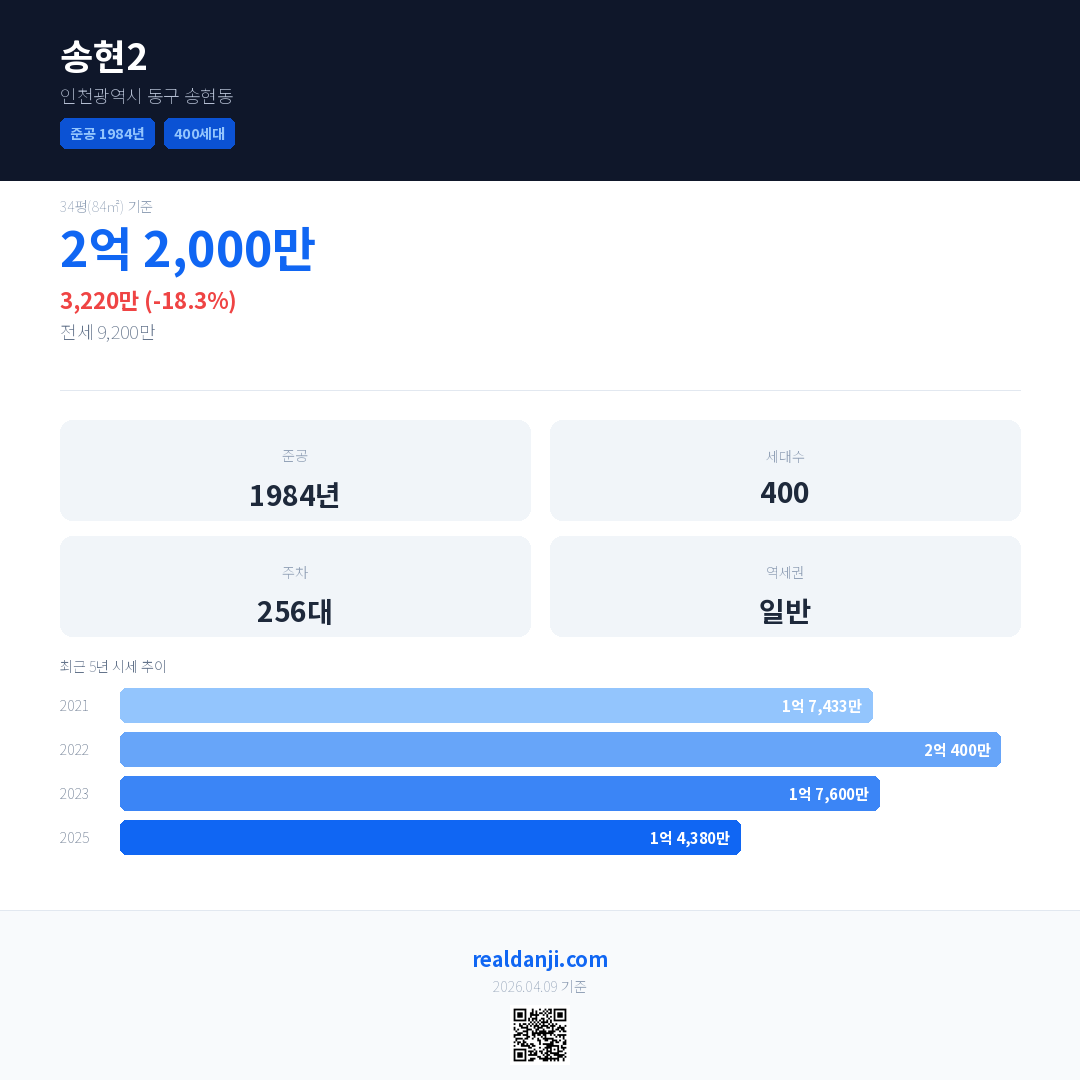 송현2은(는) 1984년에 준공되었으며, 현재 42년차입니다. 총 400세대 규모입니다.