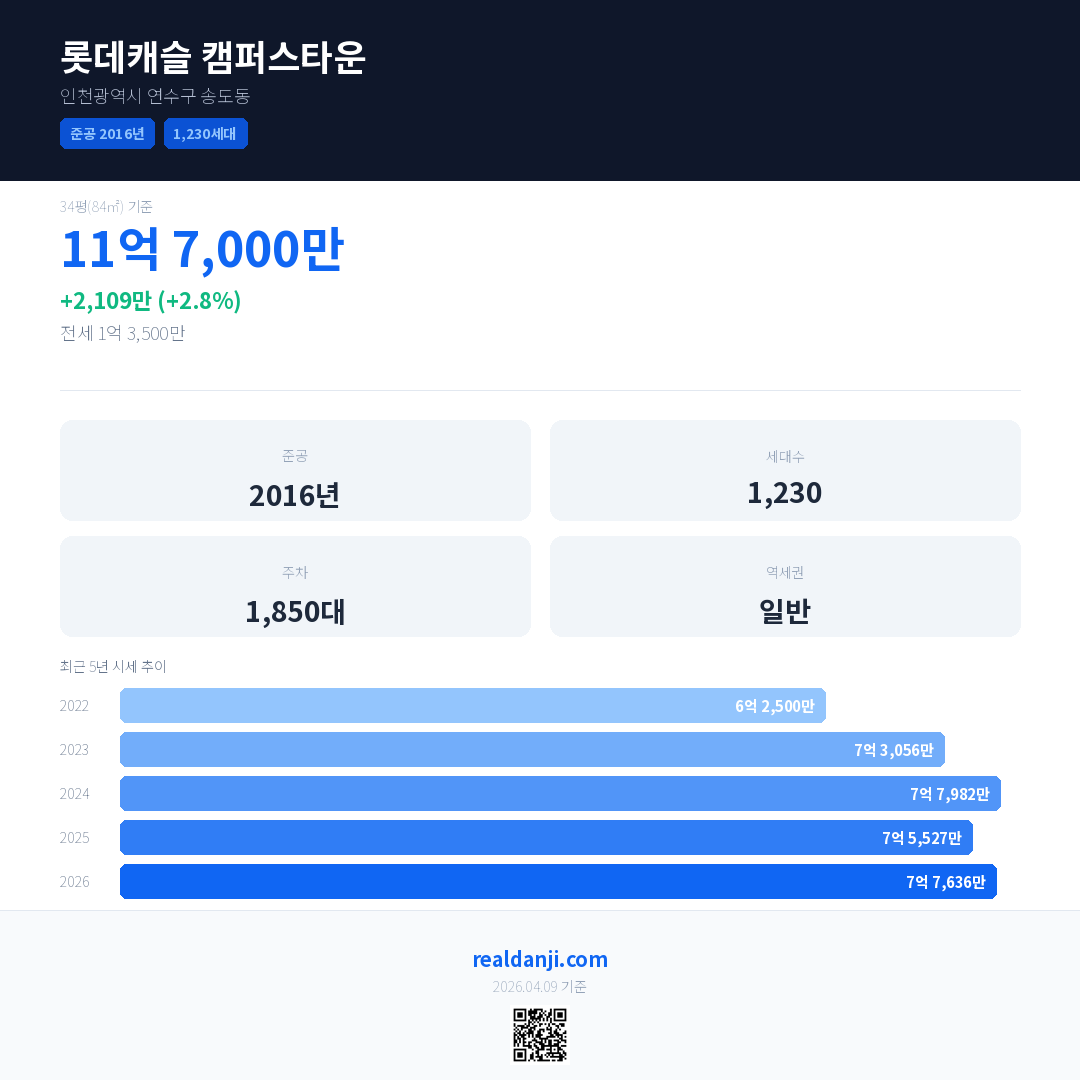 롯데캐슬 캠퍼스타운은(는) 2016년에 준공되었으며, 현재 10년차입니다. 총 1,230세대 규모입니다.
