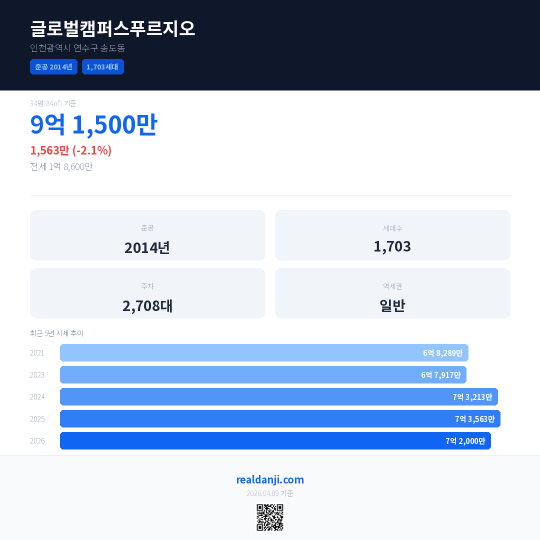 글로벌캠퍼스푸르지오 국민평형 기준 2026년 평균 거래가는 7억 2,000만으로, 전년 대비 2.1% 하락 했습니다.