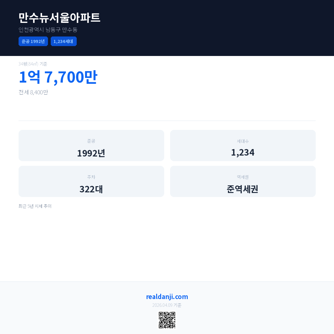 만수뉴서울아파트은(는) 1992년에 준공되었으며, 현재 34년차입니다. 총 1,234세대 규모입니다.