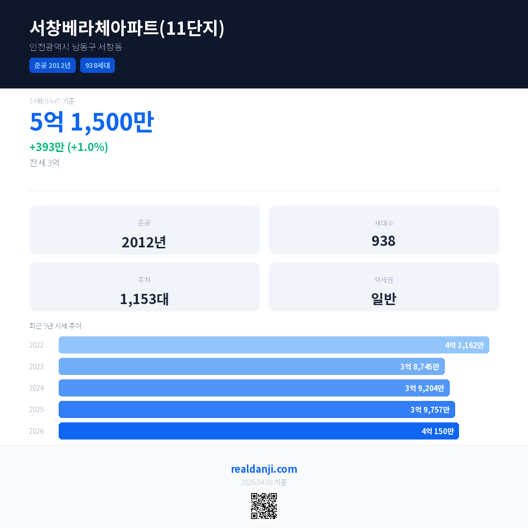 서창베라체아파트(11단지) 국민평형 기준 2026년 평균 거래가는 4억 150만으로, 전년 대비 1.0% 상승 했습니다.