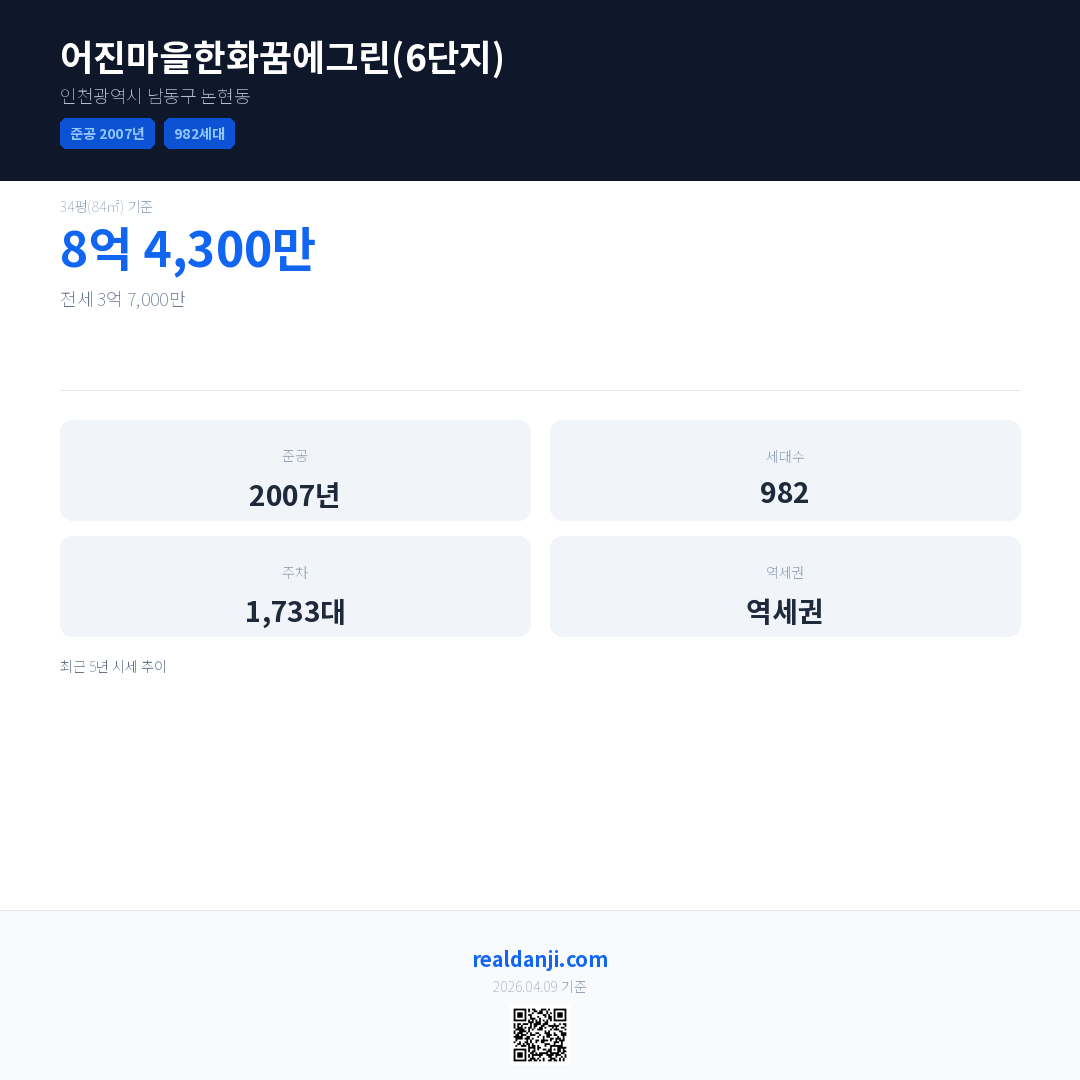 어진마을한화꿈에그린(6단지) 최근 거래가는 8억 4,300만입니다. (2026-03)