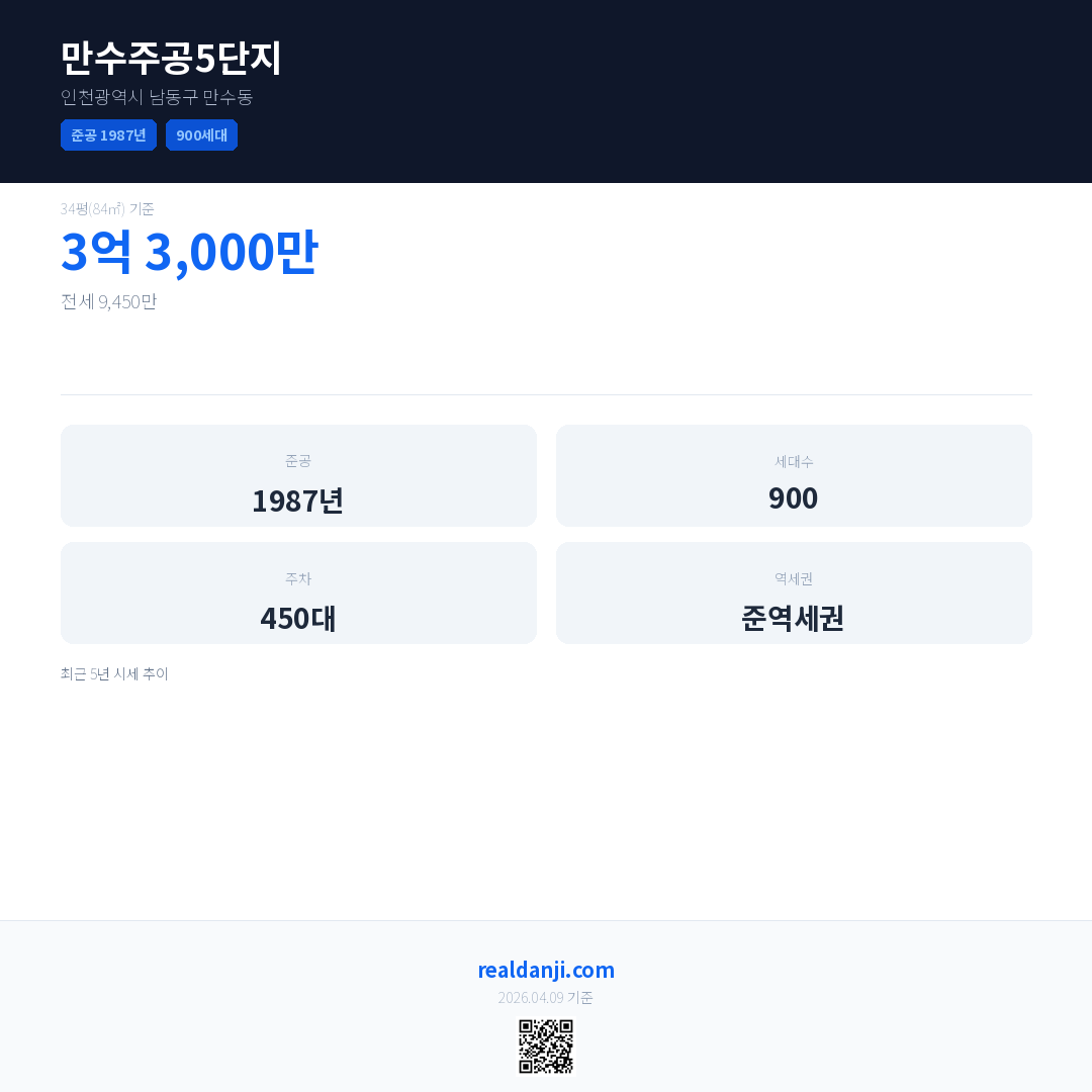 만수주공5단지은(는) 1987년에 준공되었으며, 현재 39년차입니다. 총 900세대 규모입니다.