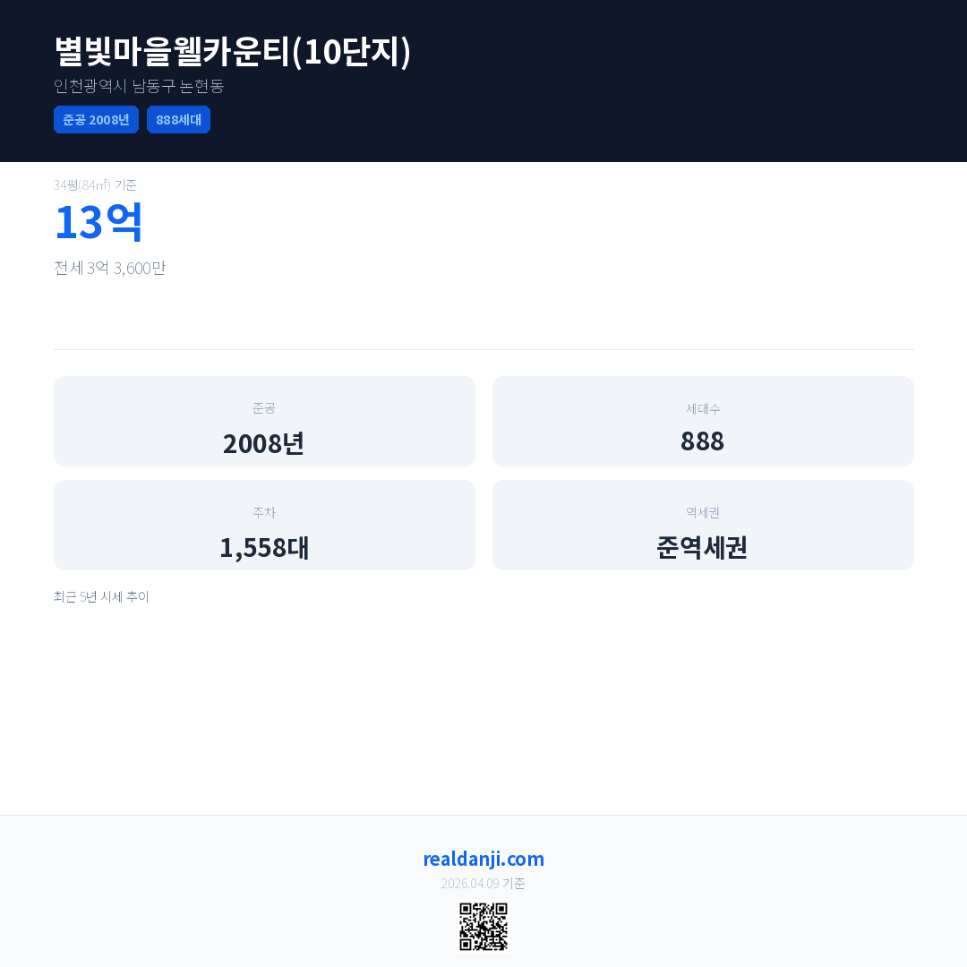 별빛마을웰카운티(10단지)은(는) 2008년에 준공되었으며, 현재 18년차입니다. 총 888세대 규모입니다.