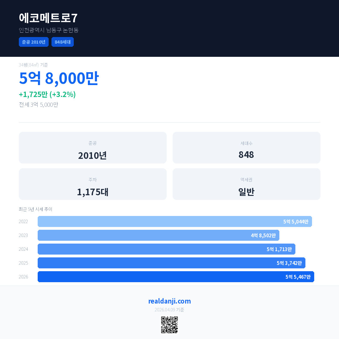 에코메트로7 국민평형 기준 2026년 평균 거래가는 5억 5,467만으로, 전년 대비 3.2% 상승 했습니다.