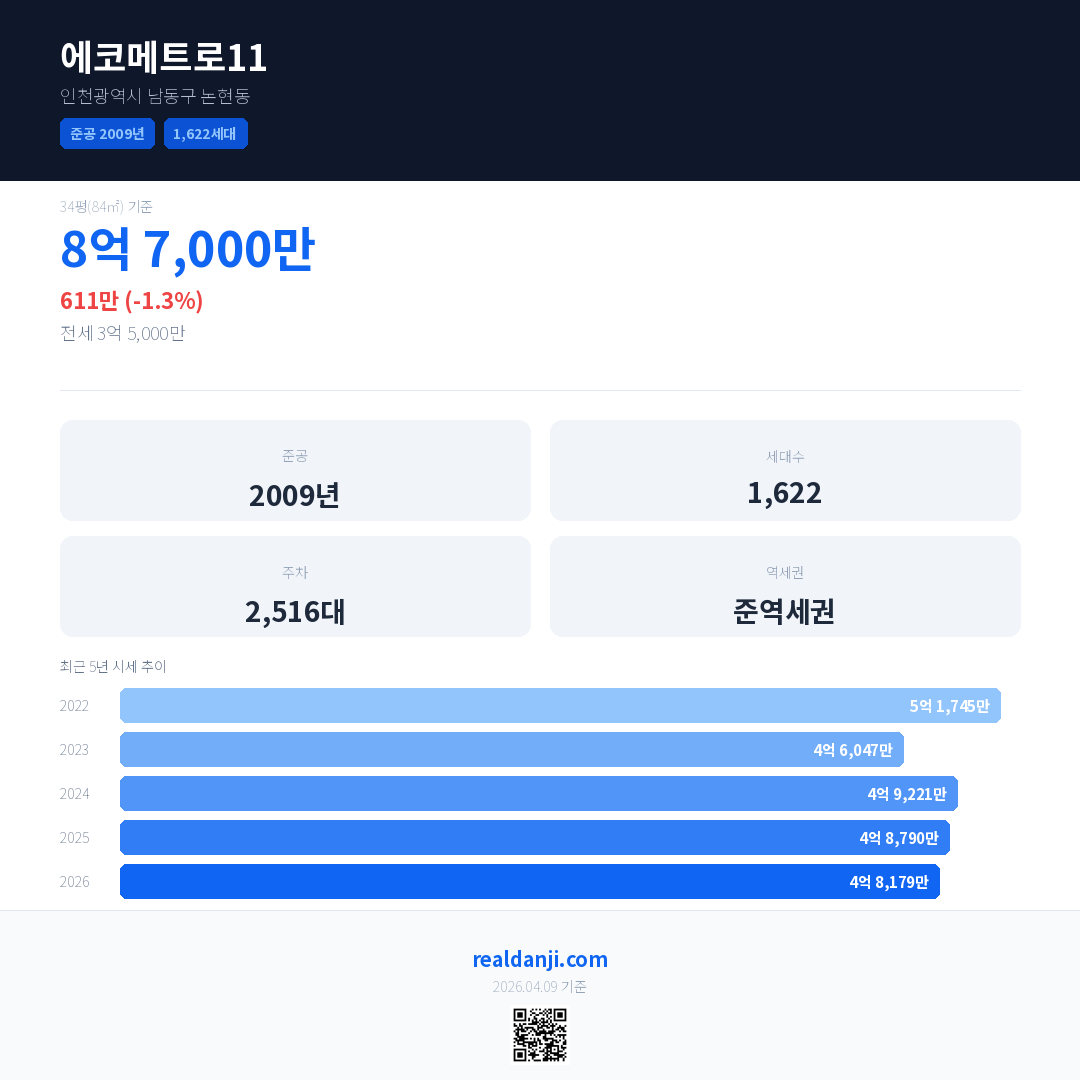 에코메트로11 국민평형 기준 2026년 평균 거래가는 4억 8,179만으로, 전년 대비 1.3% 하락 했습니다.